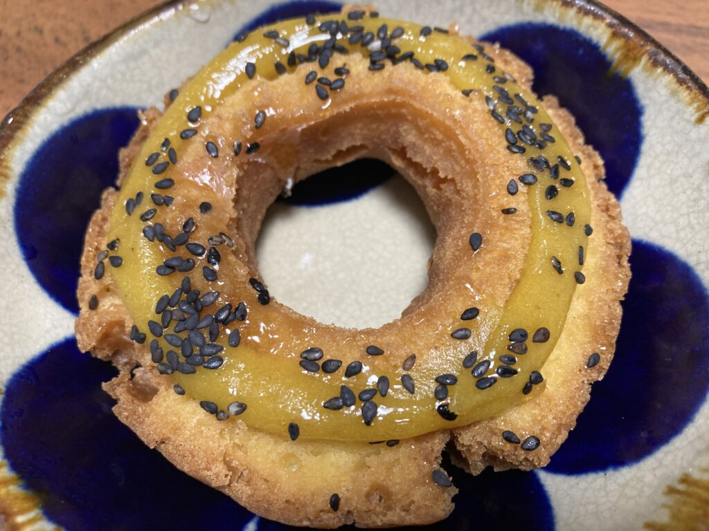 オールドファッションの上にさつまいもペーストと黒胡麻がトッピングされています。