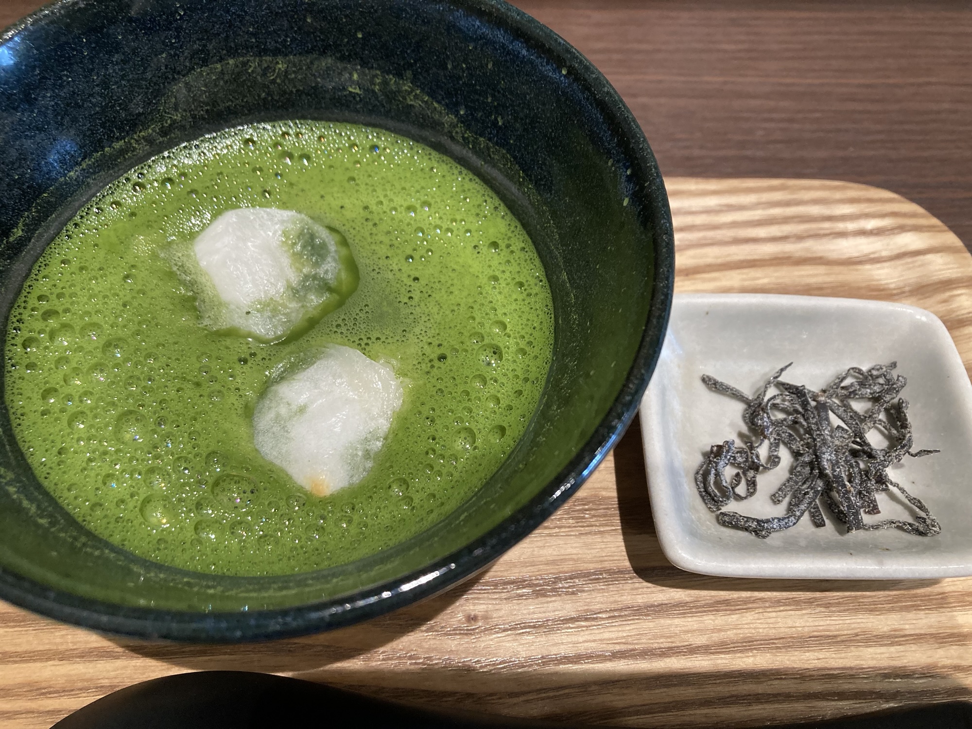 抹茶ぜんざいは、点てた抹茶にあずき?粒あん?とお餅が入ってます。