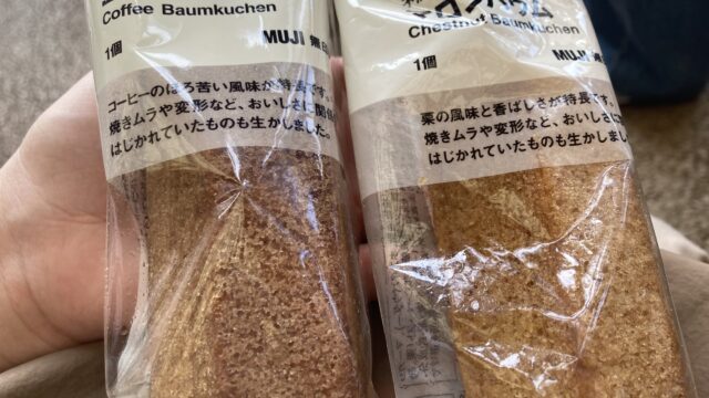 栗スイーツマロン・コーヒー 不揃いバウムクーヘン 無印良品 久しぶりに無印の不揃いバウムクーヘンを食べました。 マロン♪秋ですね。 コーヒーは定番でしょうか。 気づかないうちに色々バリエーションが増えてきましたね。 不揃いと言っても私の目には違いがわからないですし、... 2025.10.02栗スイーツ
